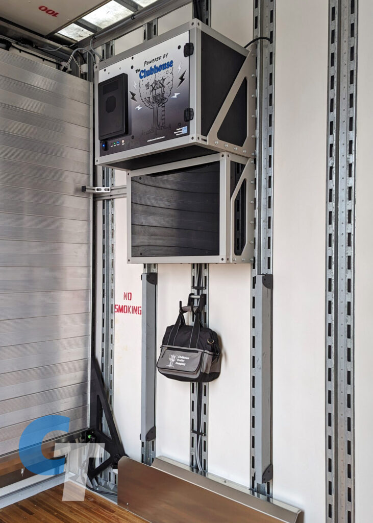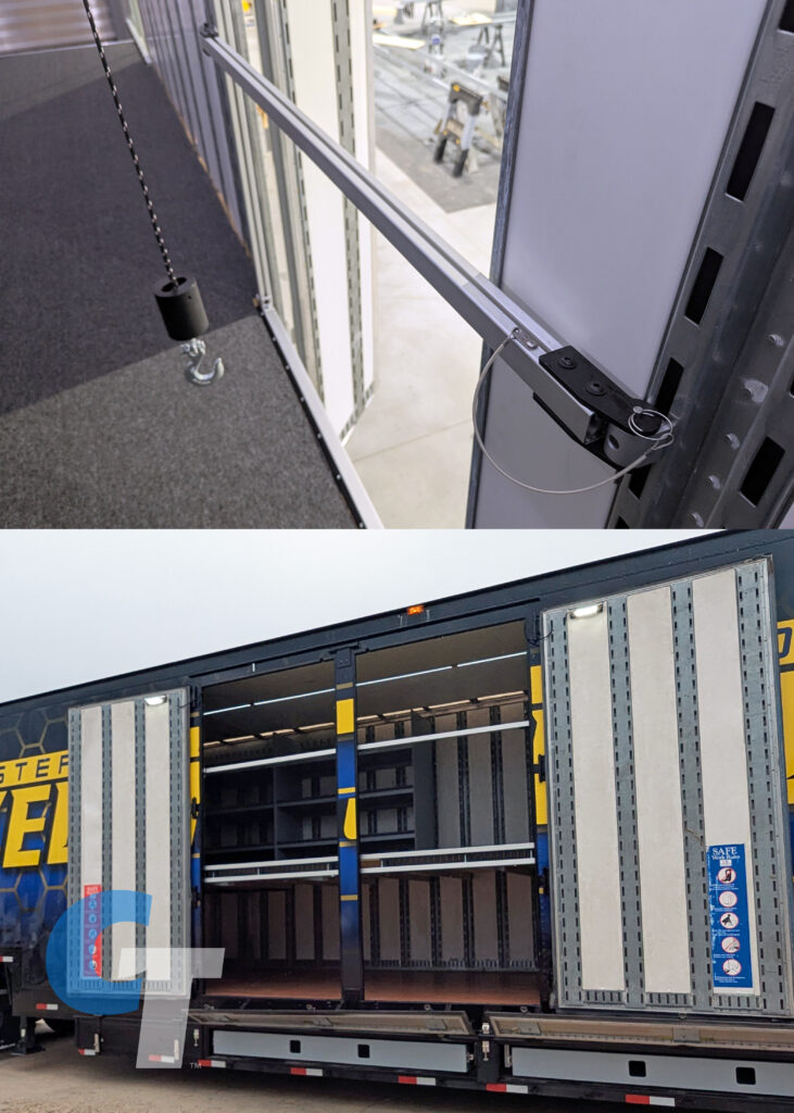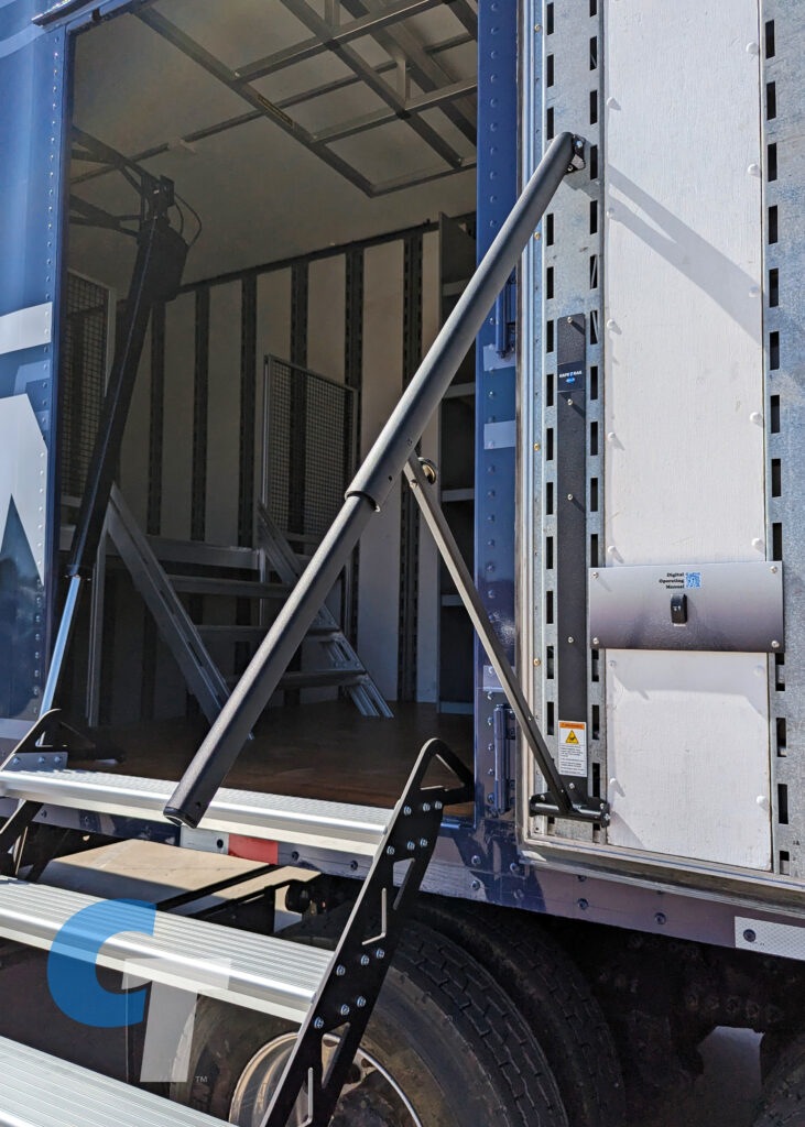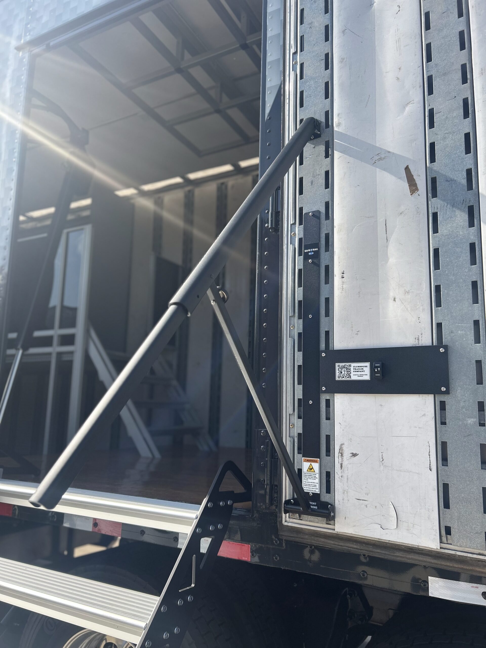 Every door on a Clubhouse Trailer semi is operable, which is why we include Door Safety Bars that span across open doorways on the 2nd floor. These bars are pinned in place for quick removal during loading and unloading. When not in use, they have a designated spot on the wall for easy storage.