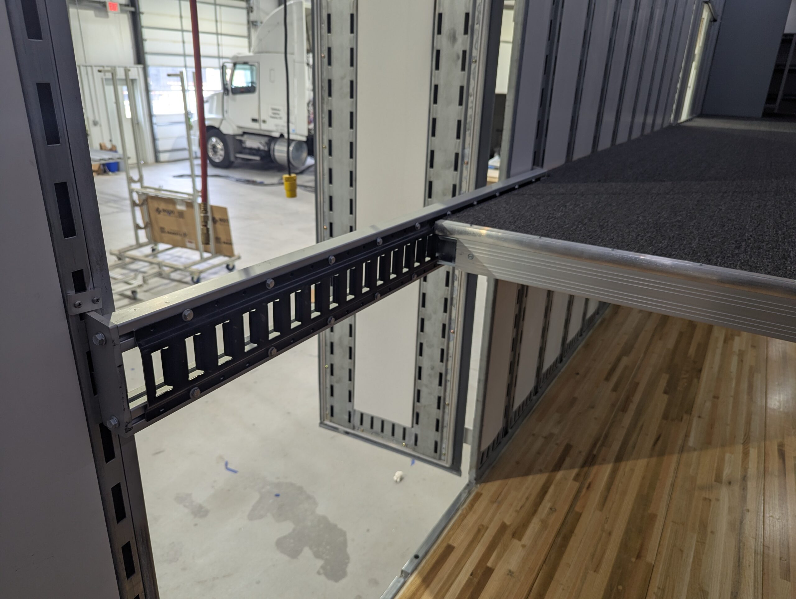 Since 2010, we’ve been leading the way in band trailer innovations. While preparing to build our first trailer, we noticed that most second floors were attached directly to the walls or side doors, making them practically unusable. Our solution? The load-bearing door span, which allows a second floor to continue across doorways, supported on both sides. These door spans have become one of our most popular DIY Kits, designed to fit a range of door widths—from the standard 52” openings to the massive “Super Barn Door” 110+ inch openings. Interested in DIY Kits? Visit our DIY Kits and Contact pages for more info.